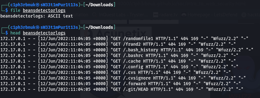 The file is a log file fron a WAF. If we look at the first few lines, just like most logs it follows a pattern: IP ADDRESS, DATE, HTTP_METHOD, FILE_REQUESTED, HTTP_VERSION, RESPONSE_BYTES, WEB_SCANNER