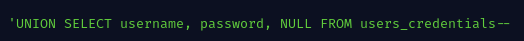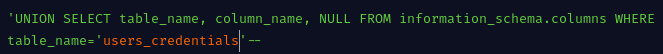 Once the attacker identifies interesting tables(say users_credentials) they can use the payload below to return all column names for that table.