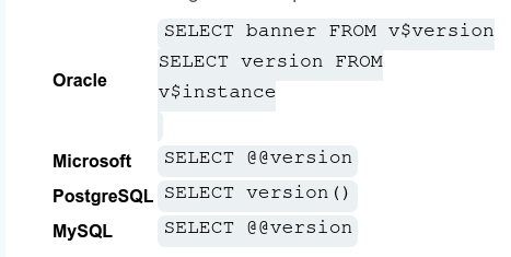 To determine the database version the attacker can query SELECT @@version. This will work for MySQL/Microsoft databases. Here’s a list of different queries to determine the database version for particular database management systems. They could try all these till they get that which works.