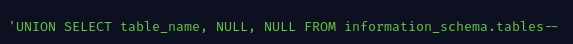 For most relational databases the information_schema contains information about tables within each database and even columns for each table. With the pyload below the attacker can retrieve all table names within a database.