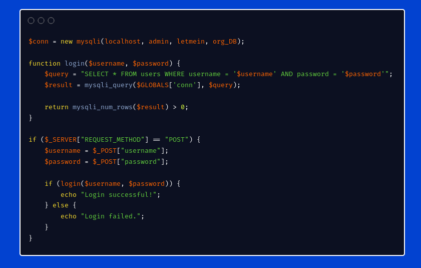 Consider an application login module that takes a username and a password then performs a SELECT query (SELECT * FROM users WHERE username = '$username' AND password = '$password) and if records with the given credentials are found the user is logged in.